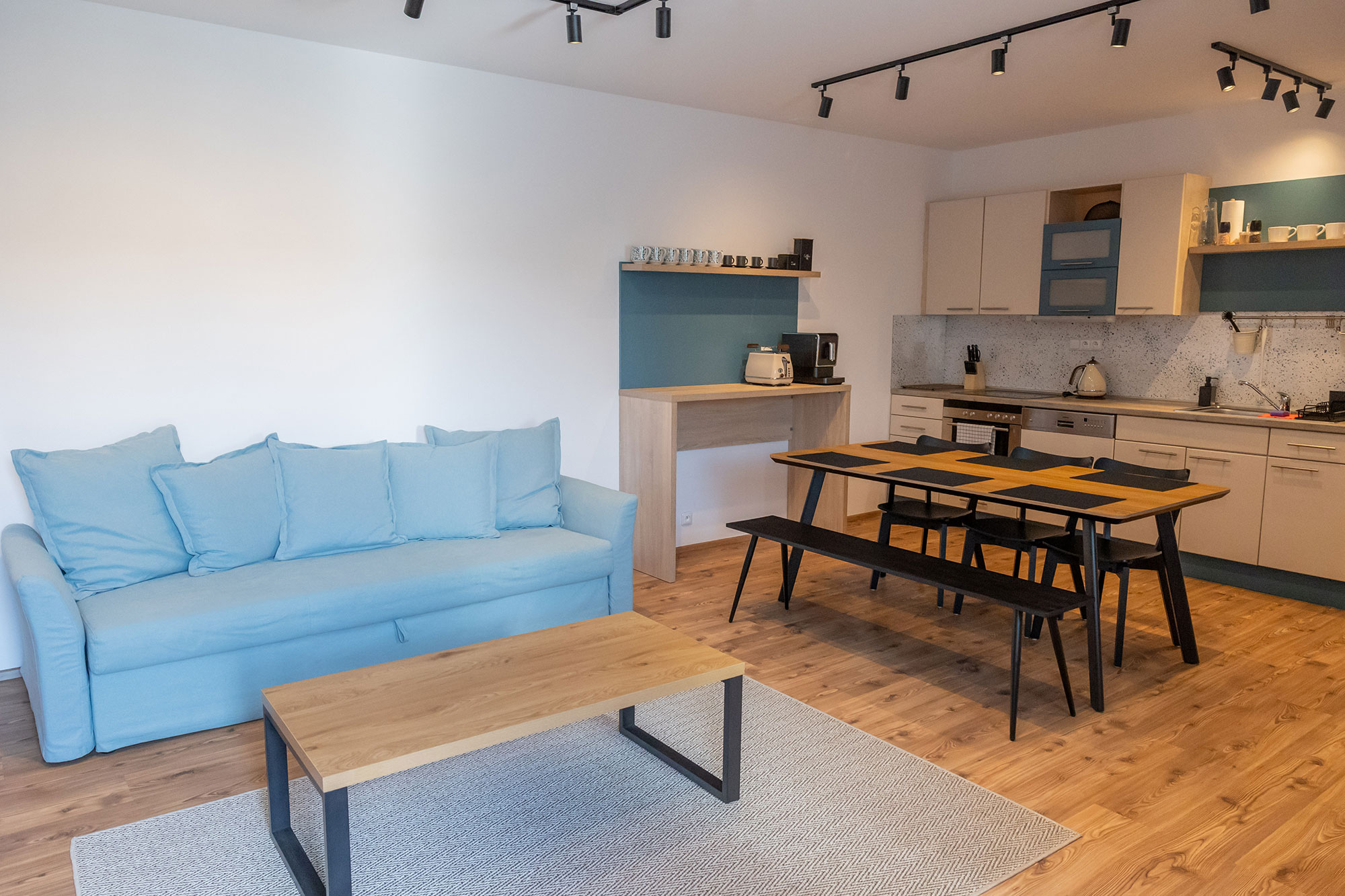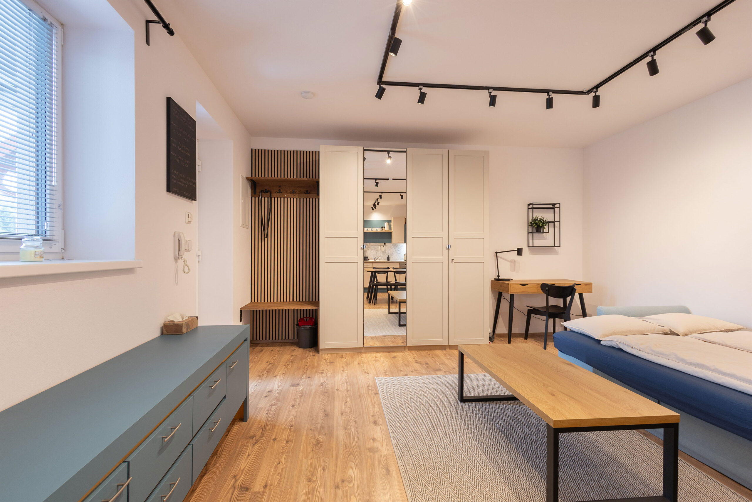 Moderně vybavený apartmán s pracovním koutkem, připravený i pro děti – postýlka, židlička, bezpečné prostředí.