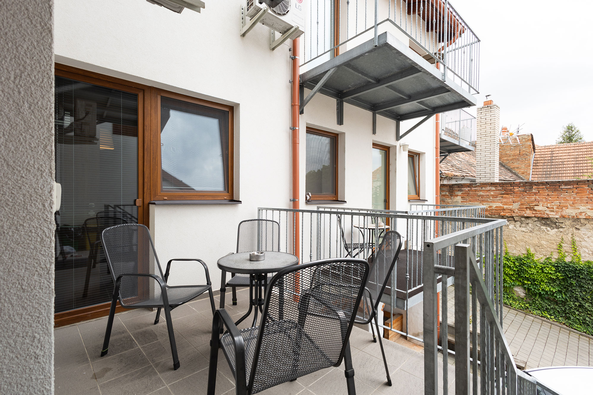 Soukromý balkon, společné posezení pod apartmánem i relax ve vinném sklípku.