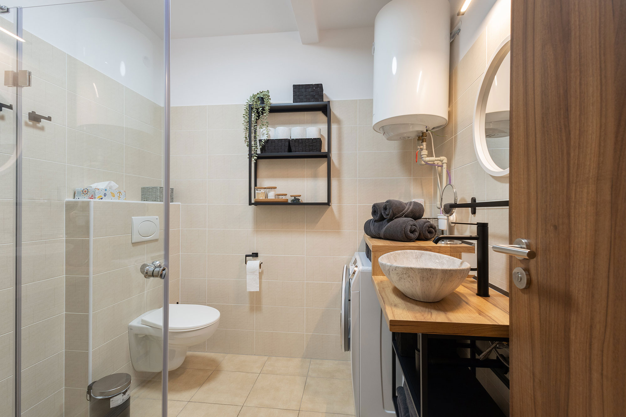 Kuchyň je plně vybavená na jakýkoli pobyt – trouba, indukce, mikrovlnka, lednice, myčka, konvice, topinkovač a kávovar na čerstvou zrnkovou kávu. Nechybí ani pračka se sušičkou, žehlička, žehlicí prkno a sušák na prádlo, což ocení hlavně rodiny s dětmi nebo hosté při delším pobytu.